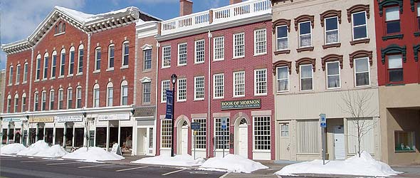 Joseph Smith’s log cabin was rebuilt on its original site, and the Church of Latter Day Saints built the Palmyra New York Temple on a portion of the former Smith Farm. The Book of Mormon Historic Publication Site – known as the Grandin Building – is where, in 1830, the Book of Mormon was first published. The Hill Cumorah and Visitor Center are on Route 21.